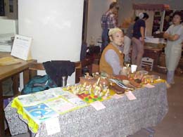 ■ミュージシャンでもある小園井俊夫さんの木彫と絵葉書なんかのお店。あいまに渋い歌をうたってくれました。 |