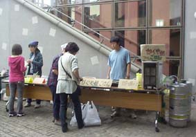 ■きのぷらの各行事に欠かせない生ビール。そして「かぐやひめごはん」がよく売れていたようです。売っている男性は事務局長のつかちゃんこと浦島司氏。 |