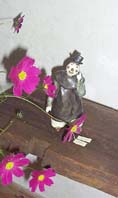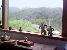 ■高橋政行・安子夫妻のアトリエにおじゃましました。すばらしいロケーションのアトリエにはコスモスがいっぱいに投げ活けられて、人形たちがさまざまな表情をみせています。 |